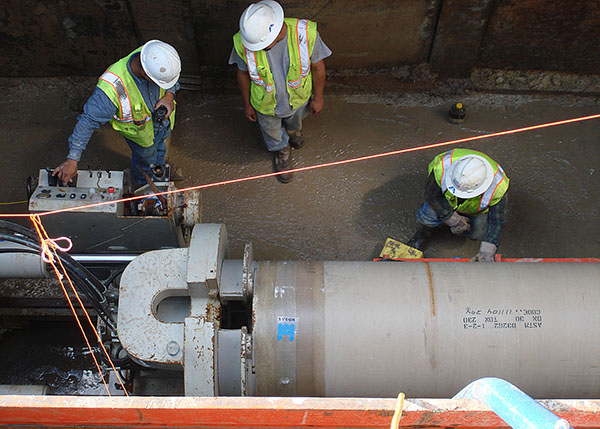 The installation depth ranged from 20 to 30 feet. Boyer purchased an Akkerman 4812, Guided Boring Machine, built specially for this project. Customary tunneling and jacking machines use diesel motors, which cause loud noise when in use. Because of the project location, in an urban environment with noise pollution codes, Boyer needed an unobtrusive option. Akkerman built this particular unit to run electrically for noise reduction.